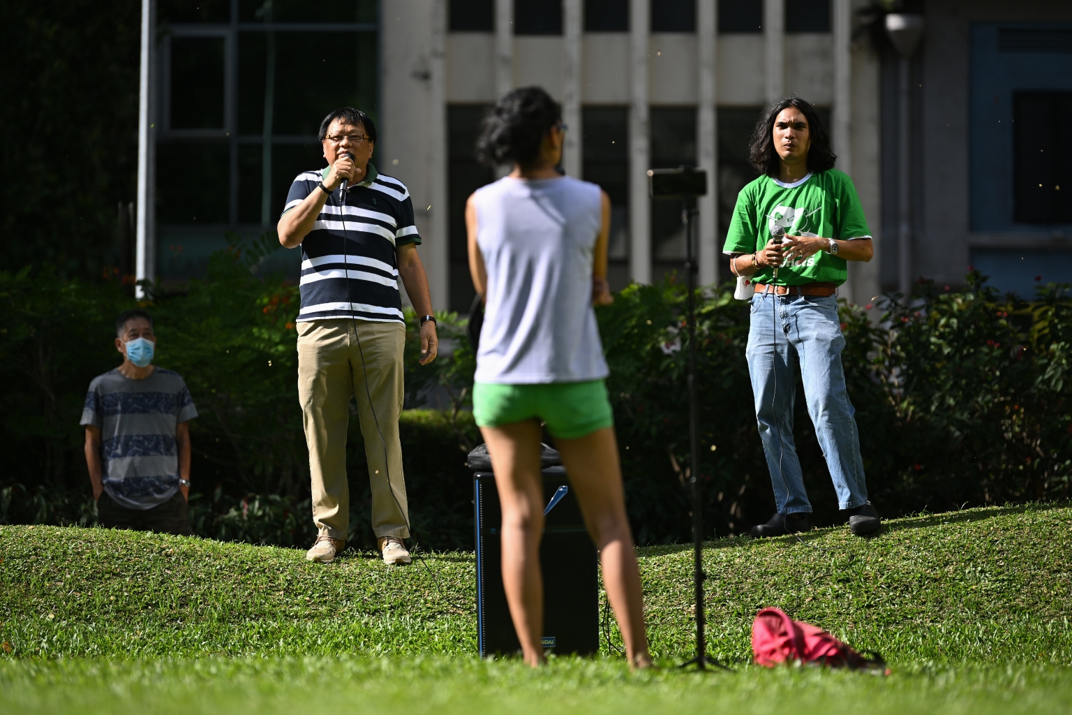 Mr Leong Sze Hian speaking with host Mr Prabu Ramachandran, (in green shirt) 34, Senior Business Development Manager, at the 'Deport former Sri Lankan President Gotabaya Rajapaksa Hong Lim Park Assembly protest public speech' at Speakers' Corner.