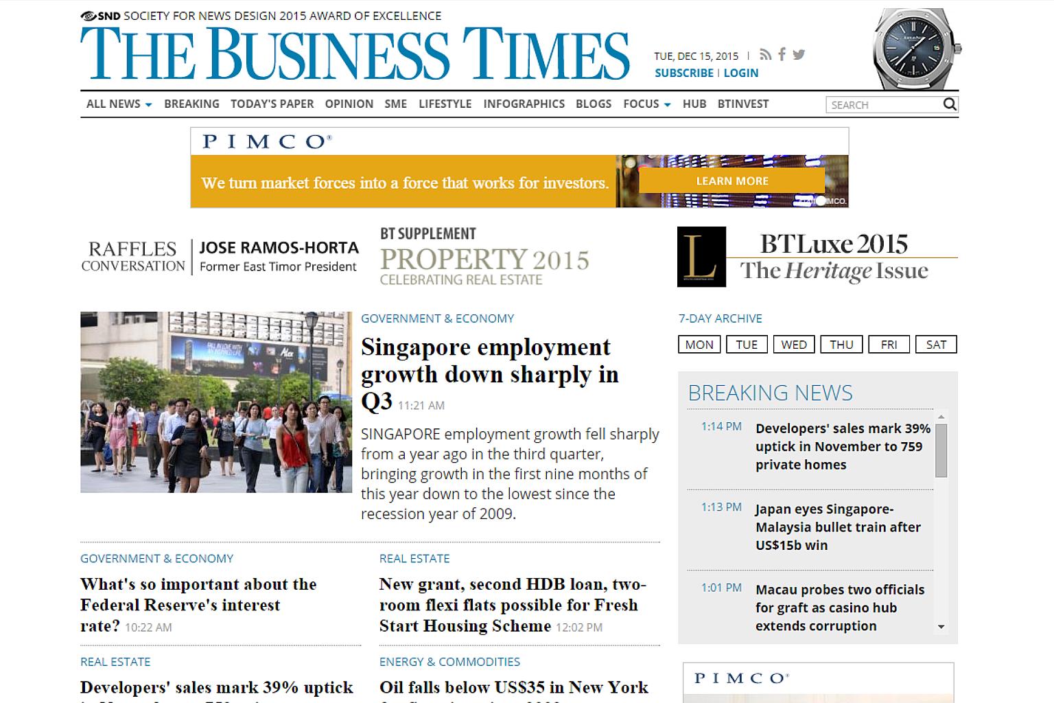 The Business Times' website and sgCarMart topped the Business & Finance, and Cars categories respectively.