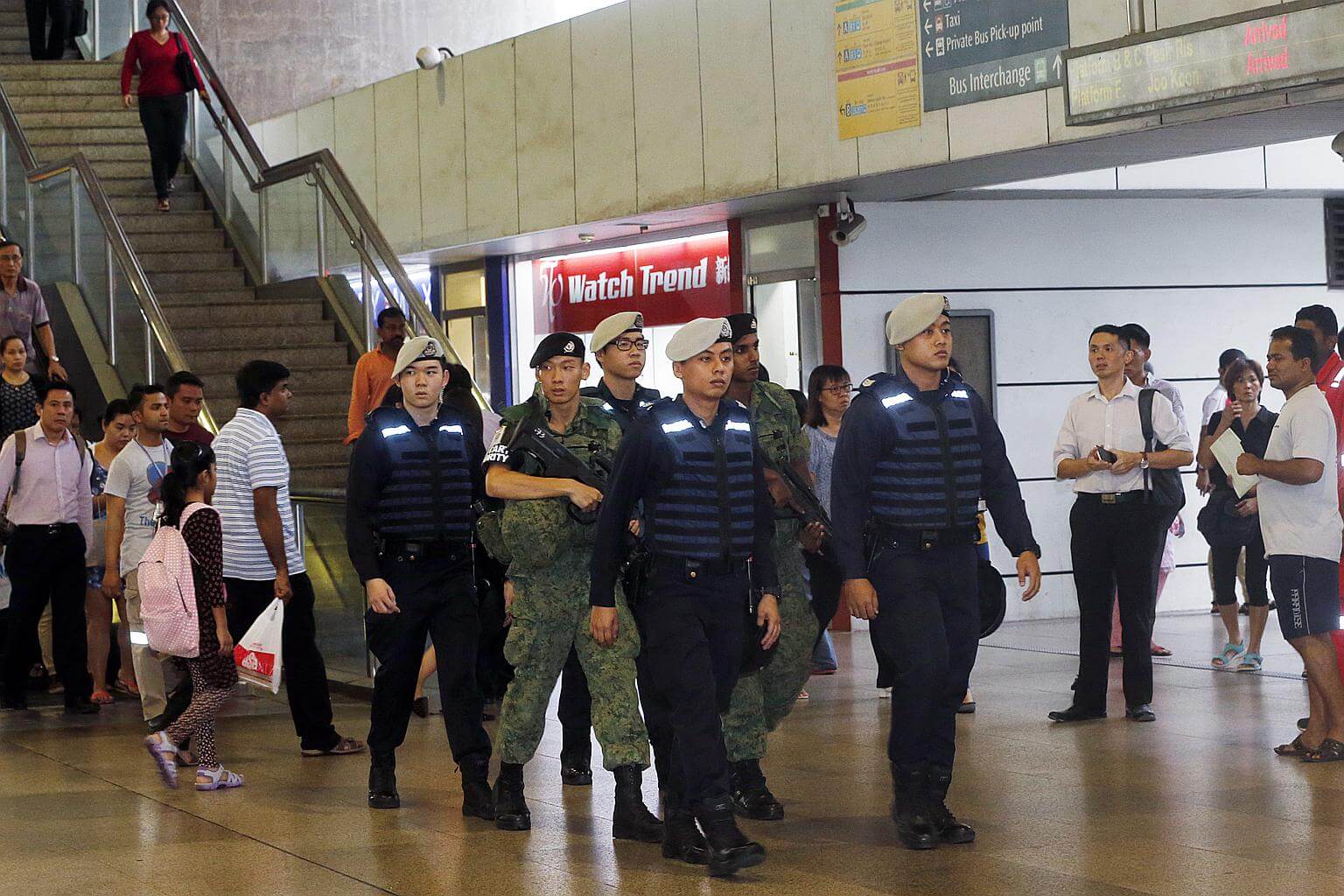 Public Transport Security Command police officers and SAF soldiers patrolling Jurong East MRT station during the evening peak hours on Oct 17, 2016.
