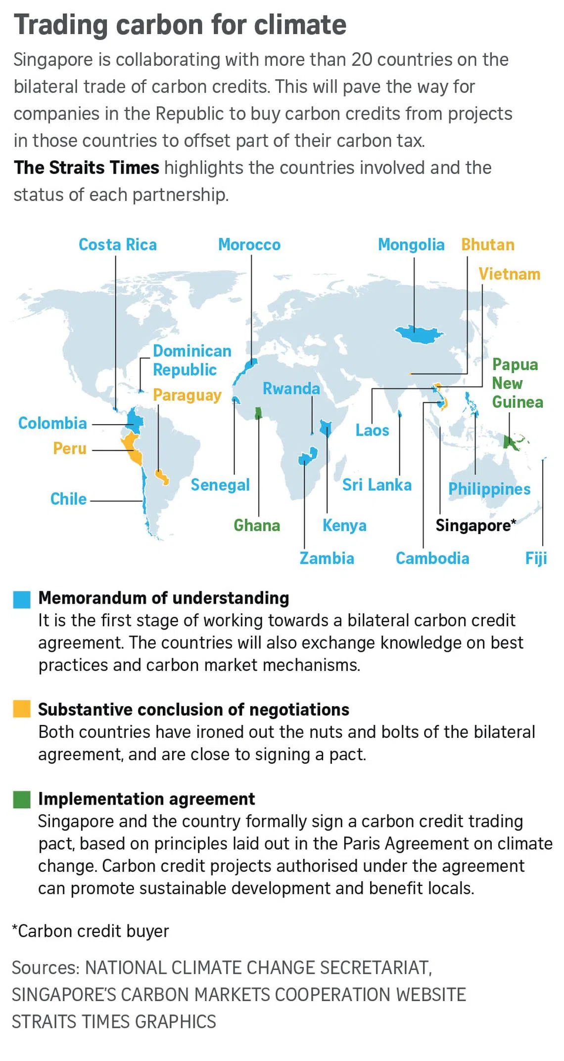 Once an implementation agreement is signed, it paves the way for carbon tax-liable companies in Singapore to buy carbon credits from projects in partner countries to offset up to 5 per cent of their taxable emissions.