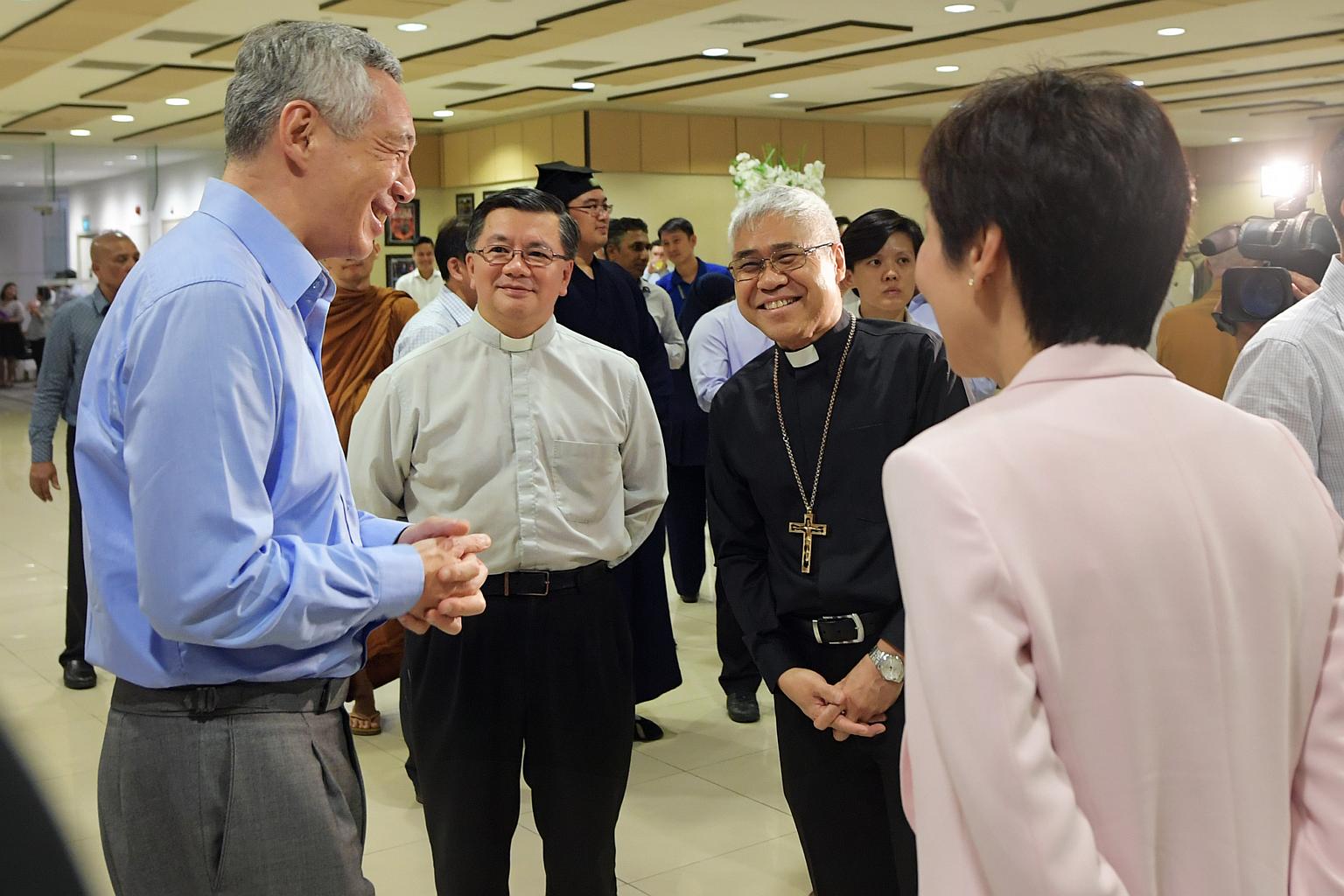 Prime Minister Lee Hsien Loong chats with Monsignor Philip Heng, Roman Catholic Archbishop William Goh and Minister Grace Fu at the ITE College Central on July 24, 2017.