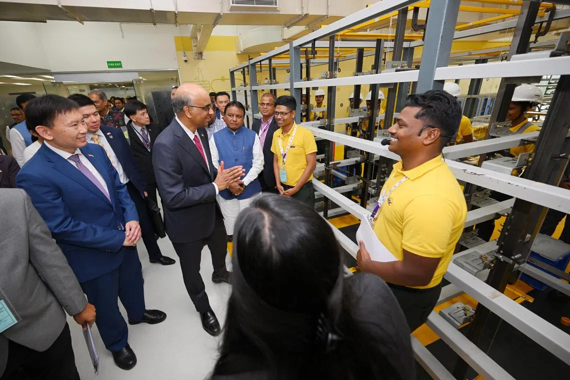 President Tharman Shanmugaratnam visiting the vertical transportation lab at the World Skill Centre in Odisha on Jan 17. Transport Minister Chee Hong Tat (left) was also present.