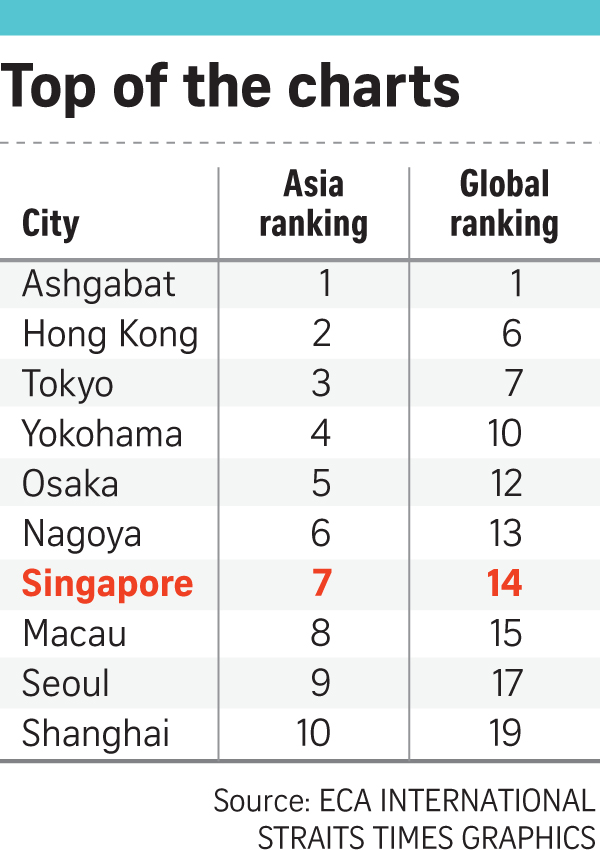 While Singapore has been overtaken by the Japanese cities Yokohama at 10th, Osaka at 12th and Nagoya at 13th, living costs have remained largely steady and it remains a costly location due to the strong Singapore dollar.