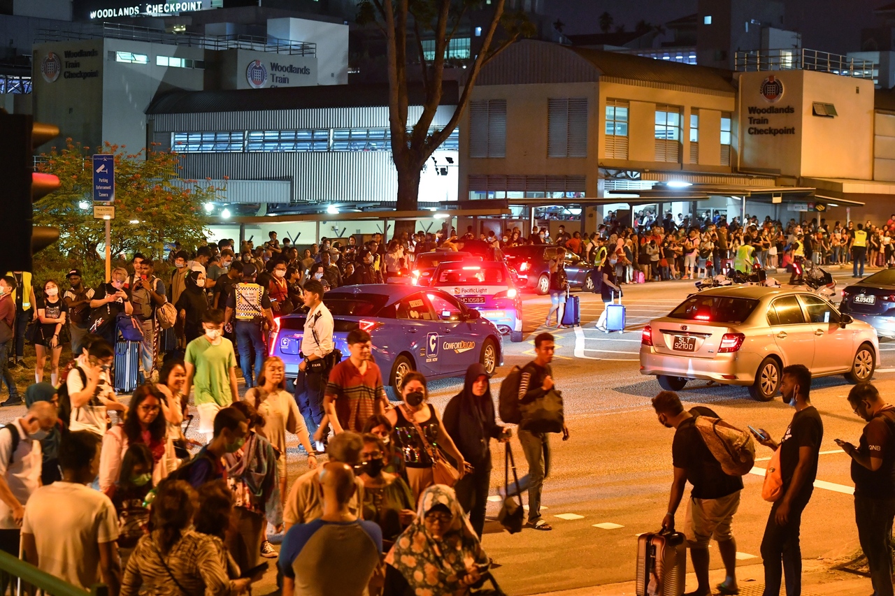 A large crowd at the passenger pick up point of the Woodlands Checkpoint at 1:15am on March 18, 2020.
