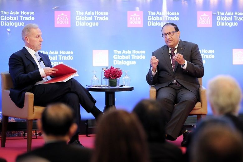 Minister for Communications and Information S. Iswaran (right) at the Asia House Global Trade Dialogue at Mandarin Oriental hotel on Nov 7, 2019.