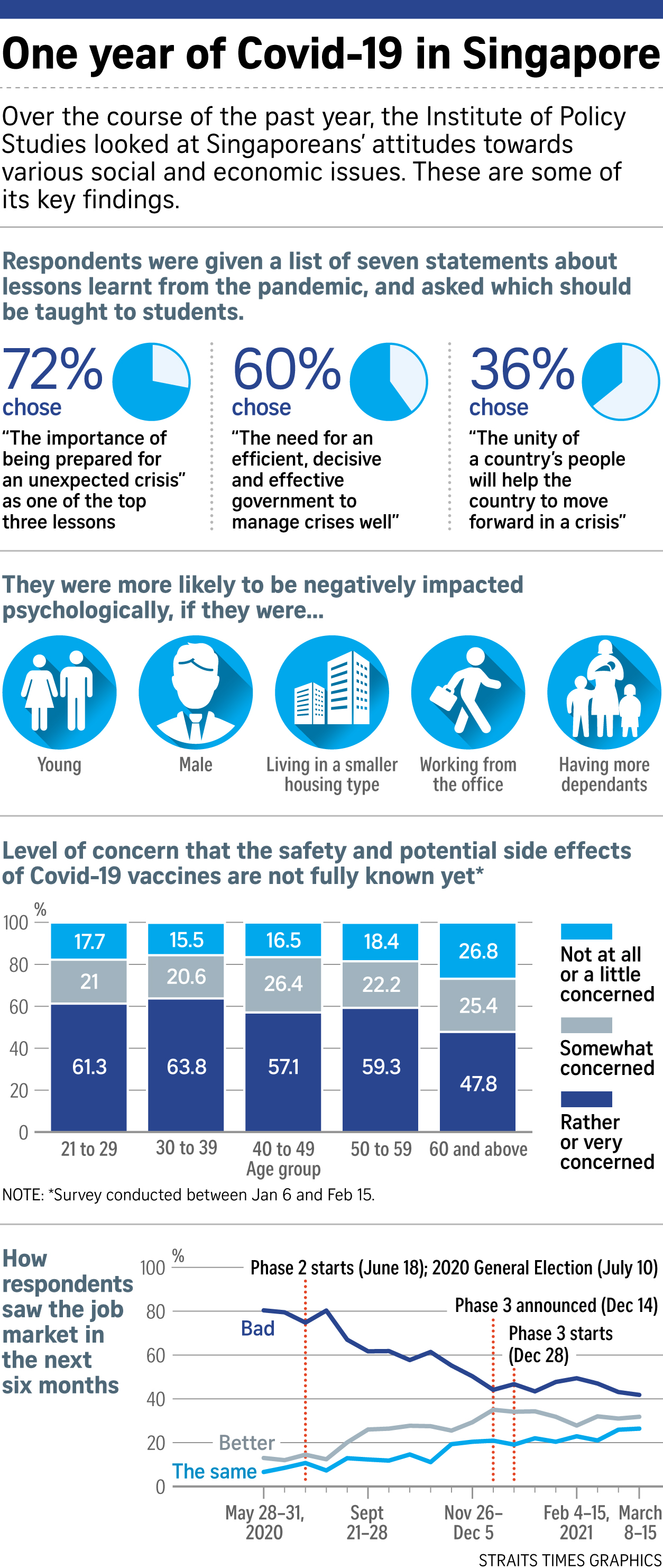 Over the past year, Singapore residents have better learnt to cope with the pandemic on various fronts, even as many remain cautious over their livelihoods, the Institute of Policy Studies (IPS) has found in a new paper.