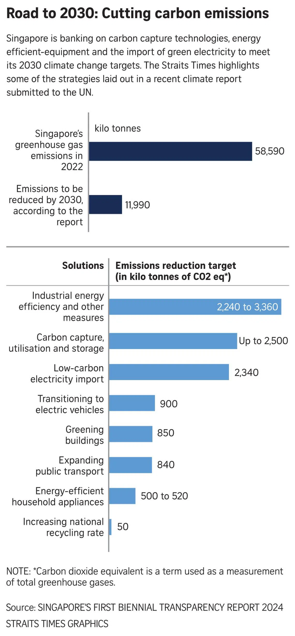 SINGAPORE - For the first time, Singapore has publicly set out how it plans to cut emissions to meet its 2030 climate targets, with energy efficiency, carbon capture technology and clean energy imports expected to be among the most effective measures.
