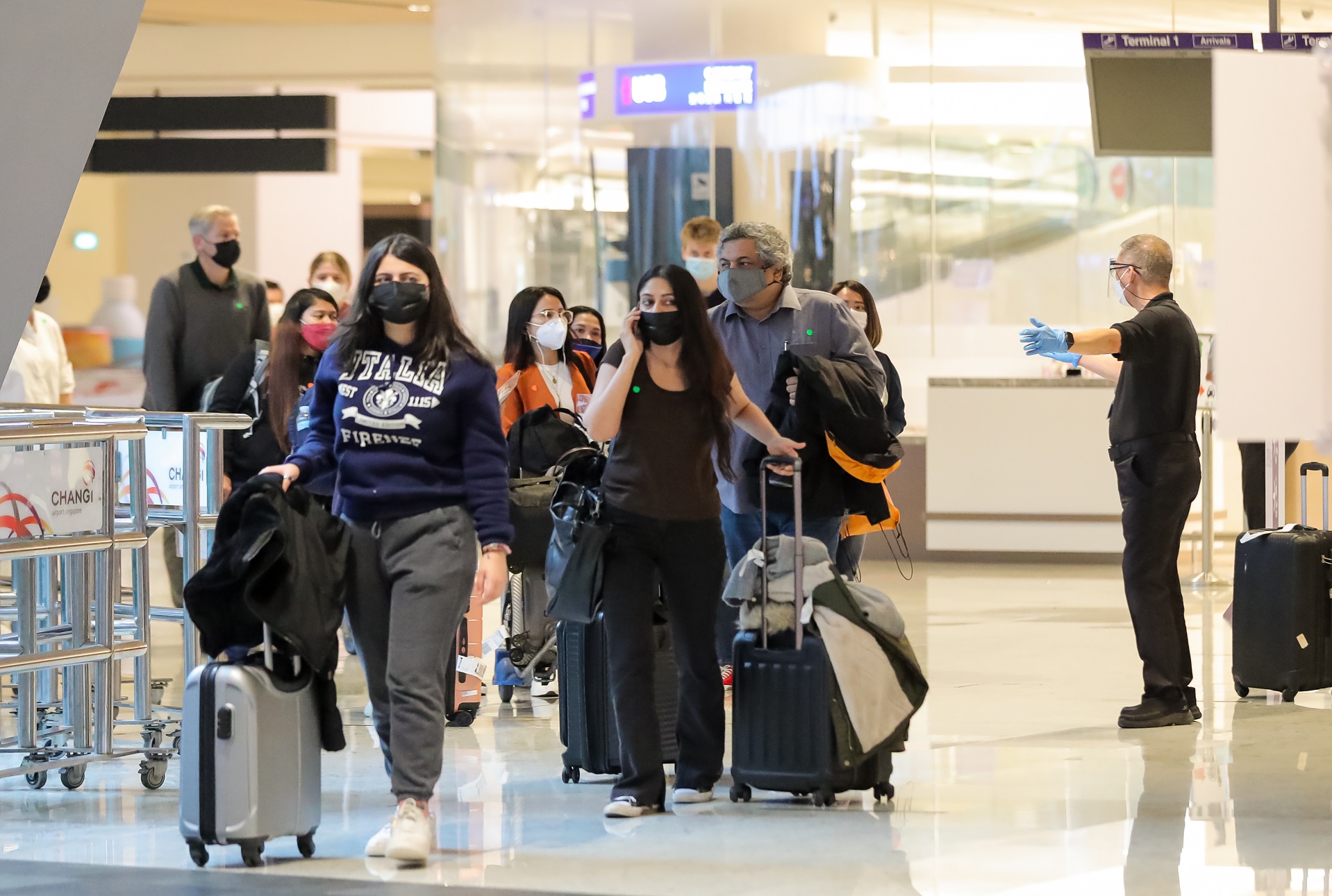 Passengers and flight crew exiting the Terminal 1 arrival hall at Changi Airport.