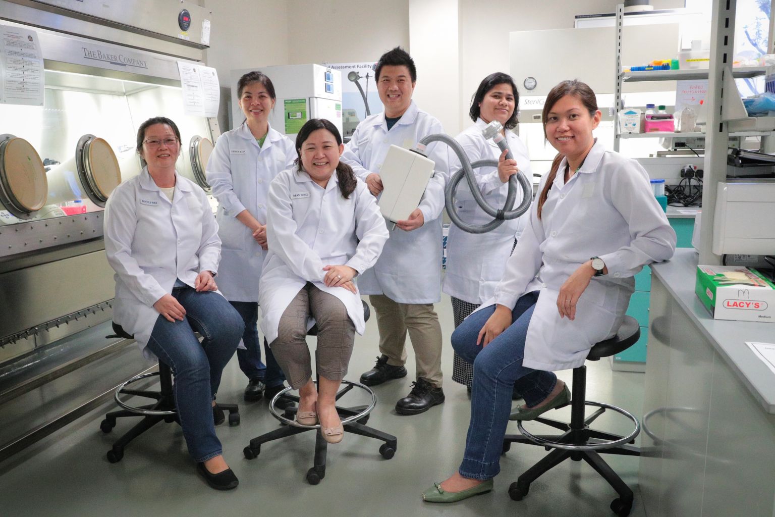 (From left) Home Team Science and Technology Agency scientists Principal Lab Manager Hoo Li Wei; Deputy Lab Manager Dr Oh Hue Kian; Director, CBRNE Centre of Expertise, May Ong; Senior Lab Technologist Zhang Jin Hua; Lab Analyst Fadzilah Salim; and Principal Lab Manager Ngoh Li Ee.