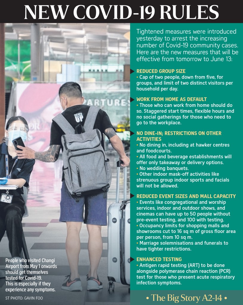 Singapore will cap social gatherings at two people and ban dining out from tomorrow until June 13 in an effort to stem a worrying increase of Covid-19 clusters and unlinked cases in the community.