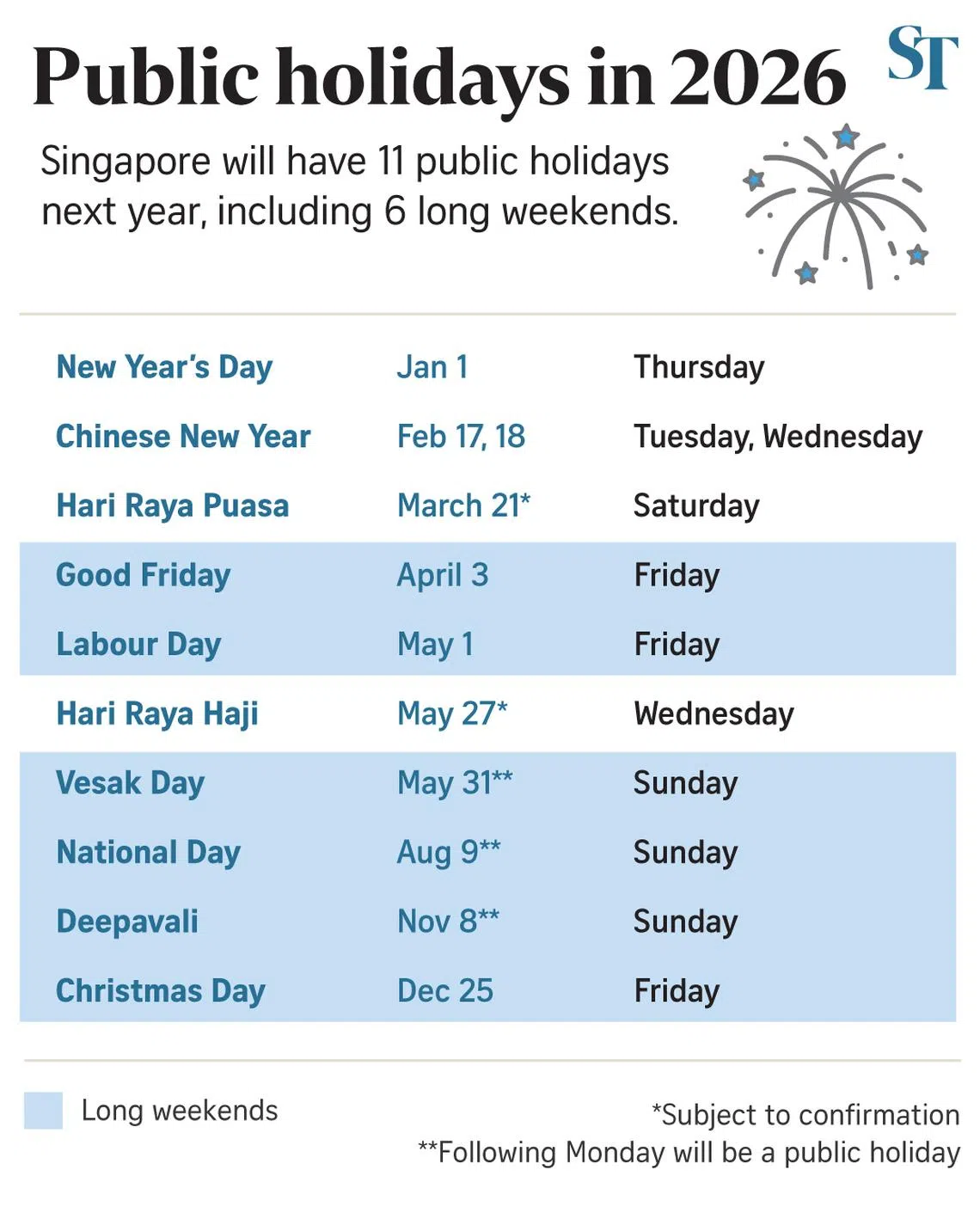 SINGAPORE - Singaporeans will be able to enjoy six long weekends in 2026, according to a list of gazetted public holidays released by the Ministry of Manpower (MOM) on June 16.