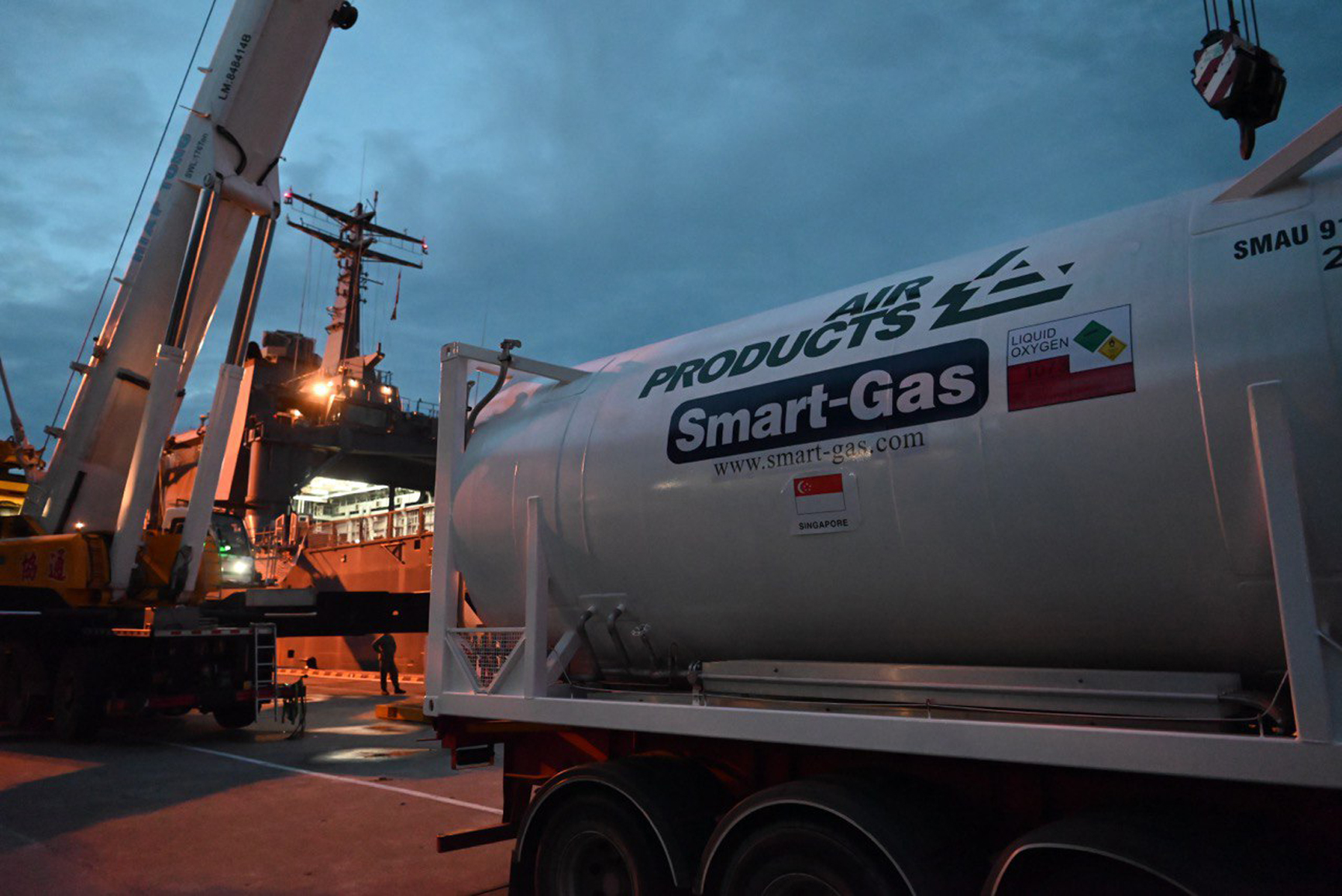 ISO tanks filled with liquid oxygen arriving at Changi Naval Base for transport by the Republic of Singapore Navy, on July 11, 2021.