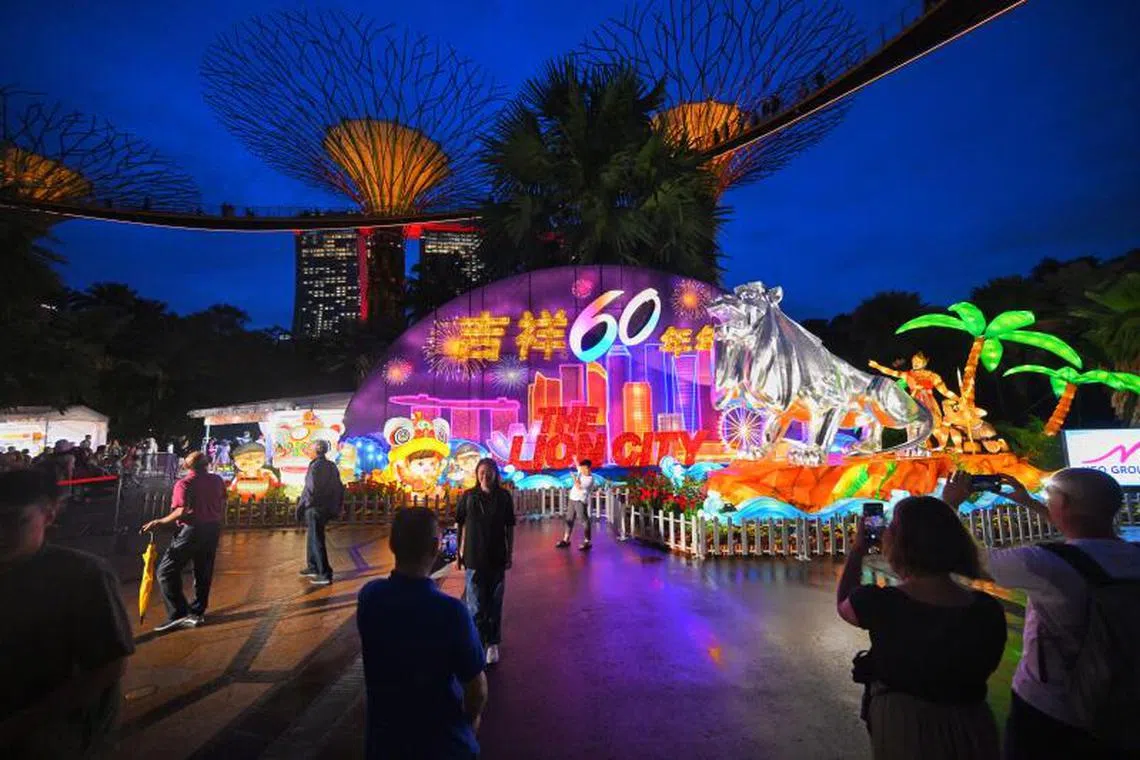 People taking pictures with The Lion City @ Supertree Grove, a SG-60 themed float at the River Hongbao 2025.