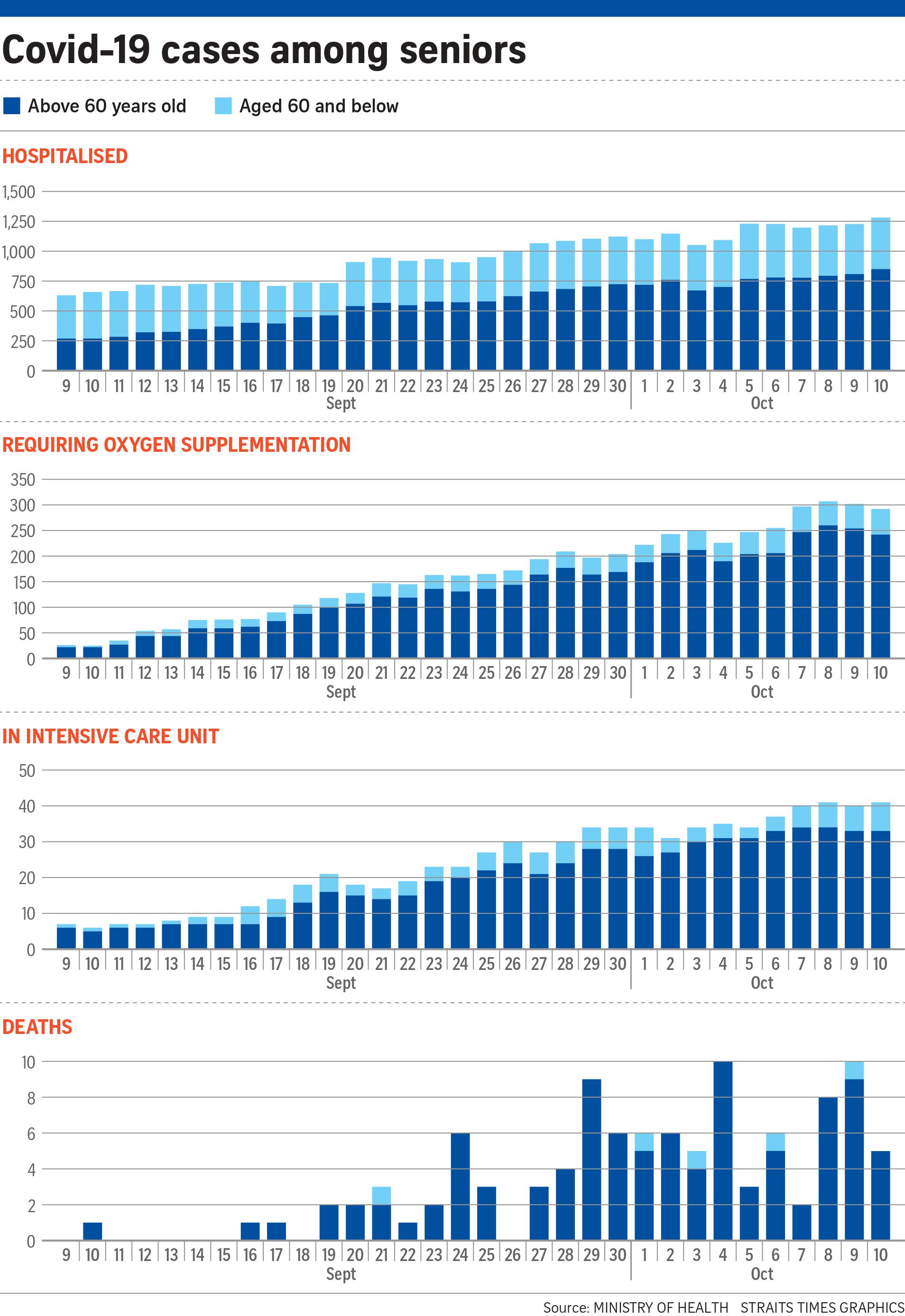 Between Sept 27, when Singapore tightened restrictions amid a spike in infections, and Oct 10, 83 people have died from Covid-19 complications - more than half of all who have succumbed to the virus since last year. Of the 83, 79 were those above the age of 60.