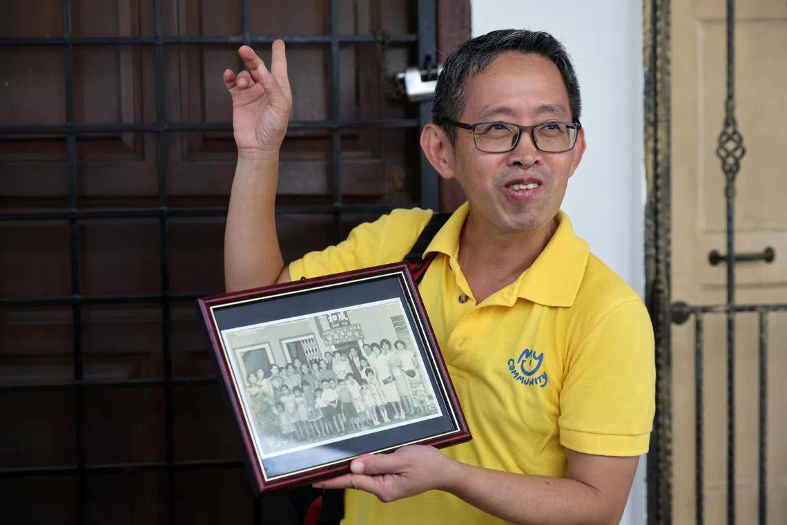 Mr Alexandre Chin, a volunteer tour guide and former Pek Kio resident, holding a photo of his family outside his parents’ matrimonial home in Sing Joo Walk. The unit is occupied by a relative now.