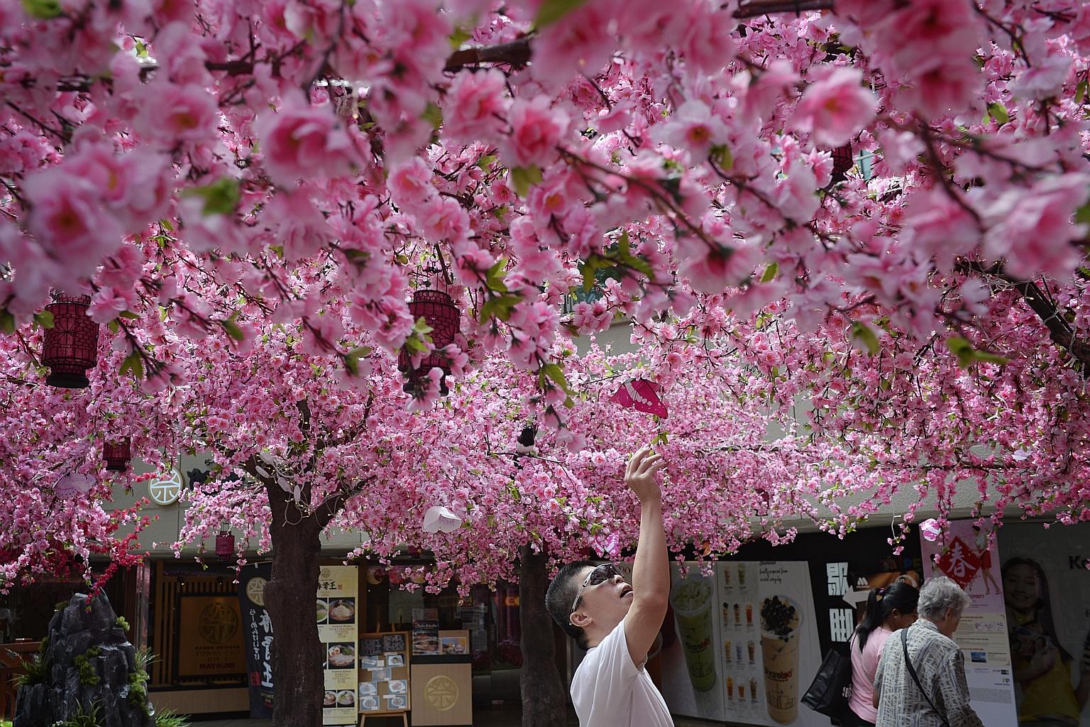 Parkway Parade and Marina Bay Sands have installed fake cherry trees to usher in the year of the monkey - though other malls are taking the theme more literally.