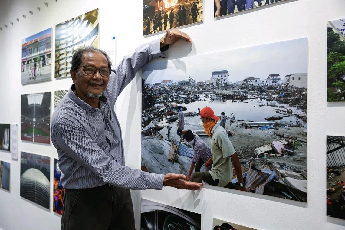 Former ST photographer Aziz Hussin with his photograph depicting the aftermath of the 2004 tsunami in Aceh, which is on display at the Singapore Stories: The Heart Of A Nation photo exhibition that opened on Nov 7.