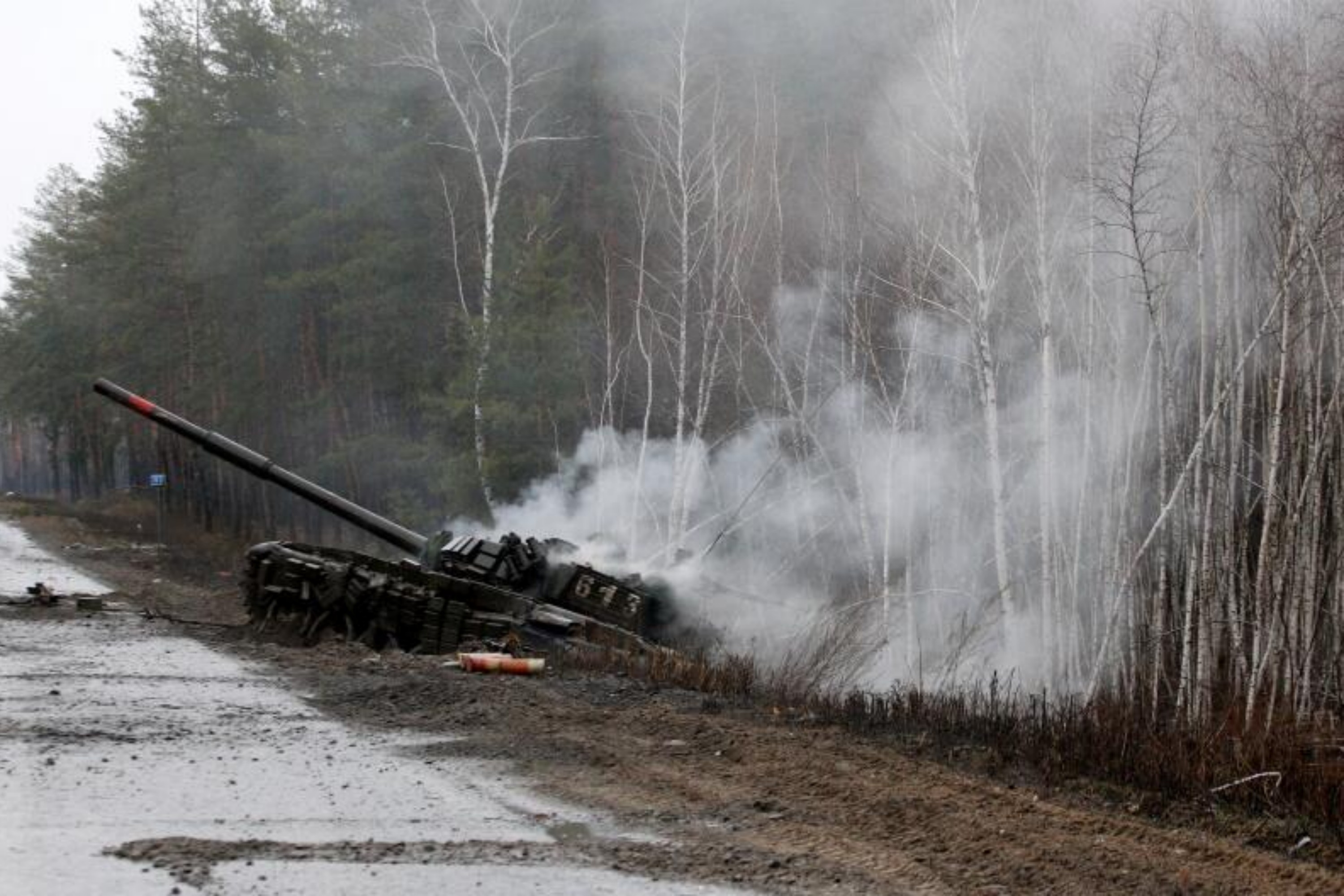 Smoke rises from a Russian tank destroyed by Ukrainian forces in Lugansk on Feb 26, 2022.