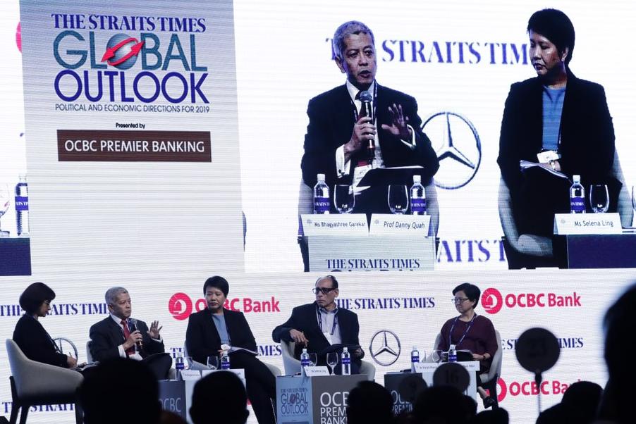 (From left) Ms Bhagyashree Garekar, Deputy Foreign Editor, ST, Professor Danny Quah, Dean and Li Ka Shing Professor in Economics, Lee Kuan Yew School of Public Policy, National University of Singapore, Ms Selena Ling, Head of Treasury Research & Strategy and Member of OCBC Wealth Panel, OCBC Bank, Mr Vikram Khanna, Associate Editor, ST and Ms Goh Sui Noi, East Asia Editor, ST, during the panel discussion at The Straits Times Global Outlook 2019.