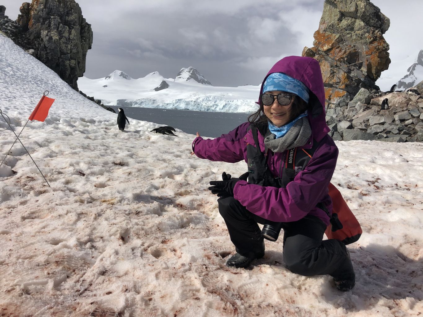 ST Science and Environment correspondent Audrey Tan posing with chinstrap penguins in Antarctica in 2019.