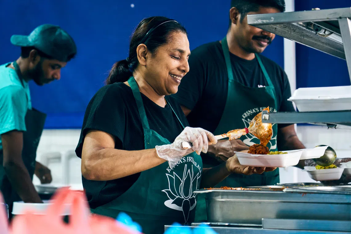 Ms Latha Govindasamy, co-founder of Krsna’s Free Meals, at the soup kitchen in Little India where she and her family serve hot, wholesome meals daily to migrant workers.