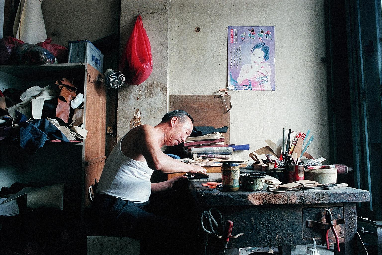 Shoemaker Soong Kwek Choong hard at work, while a car battery on the shelf behind him is used to power the fan in his shop at Gay World Amusement Park. This was on July 14, 2000, when there was a blackout.