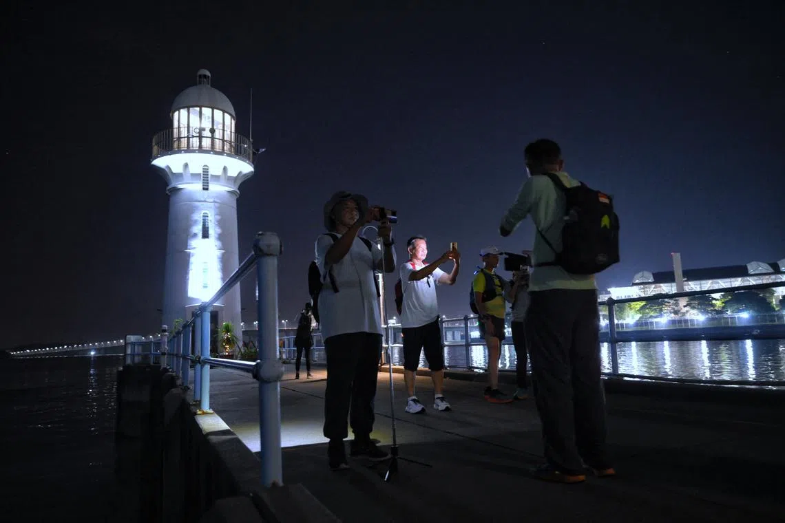 Members of LongwalkSG take pictures in front of the Raffles Marina Lighthouse, their starting point, before commencing their overnight walk on April 9.
