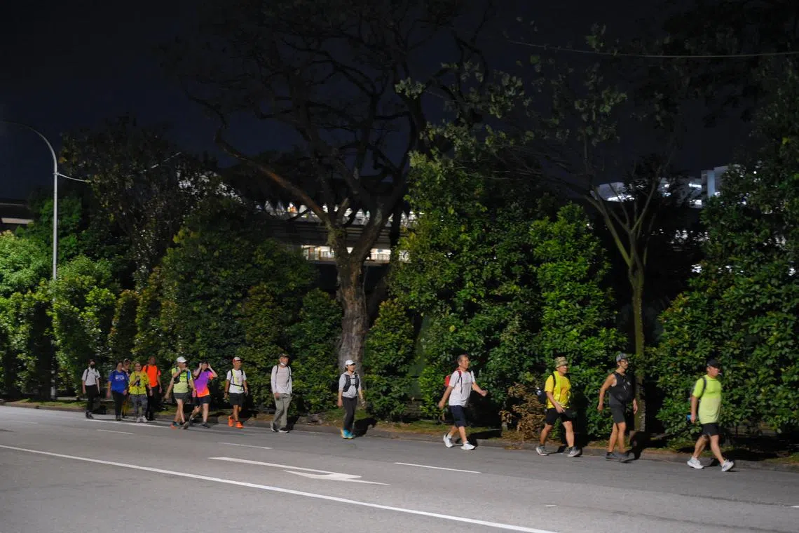 Members of LongwalkSG, a walking group in Singapore, walk past an industrial area in Tuas during an overnight walk on April 9.
