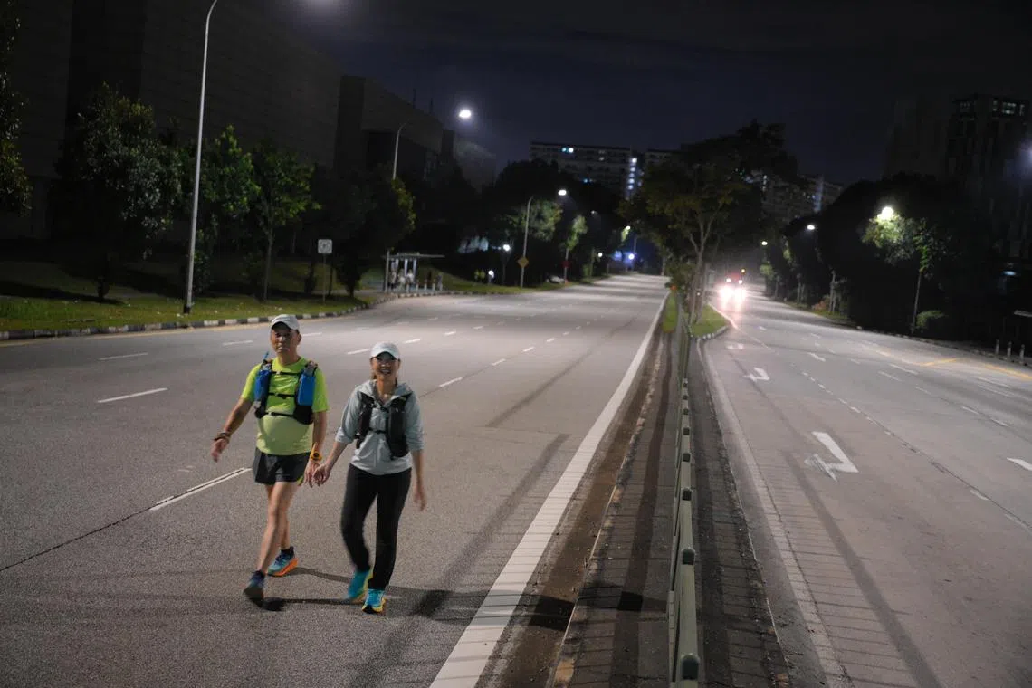 Mr Alvin Lok (left), 60, and his girlfriend, Ms Michelle Wong, 56, walk across a road in Tuas during an overnight walk on April 9.