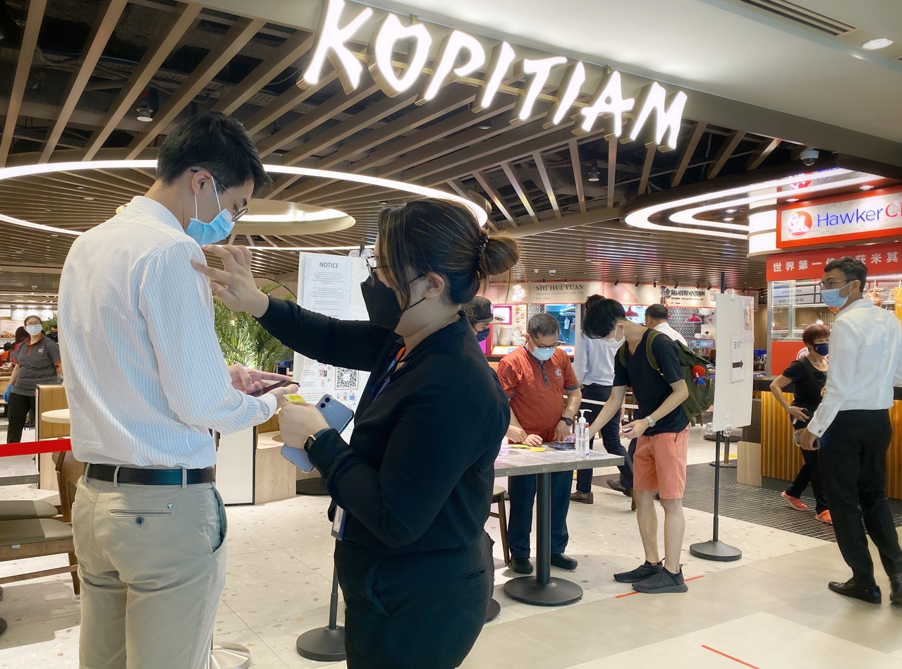 SINGAPORE - Vaccinated people who wished to eat at air-conditioned foodcourts in malls such as Junction 8, Nex and Plaza Singapura were checked at the entrance and given a sticker to identify them on Tuesday (Aug 10), the first day the ban on dining in was lifted.