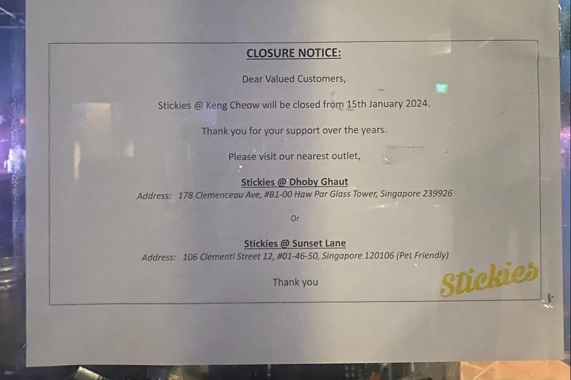 SINGAPORE - Popular watering hole Stickies Bar abruptly closed two of its outlets on Jan 15 and laid off more than 30 employees, amid workers’ complaints about delayed salary payments.