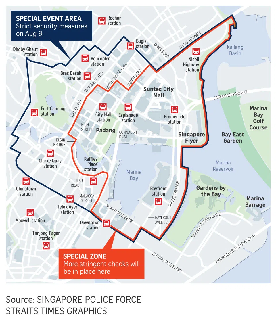 The measures will include checks on individuals as well as vehicles, and ensure that banned items do not enter the special event zone. They will be in place on Aug 9 from midnight to 11.59pm, the police said on Tuesday.