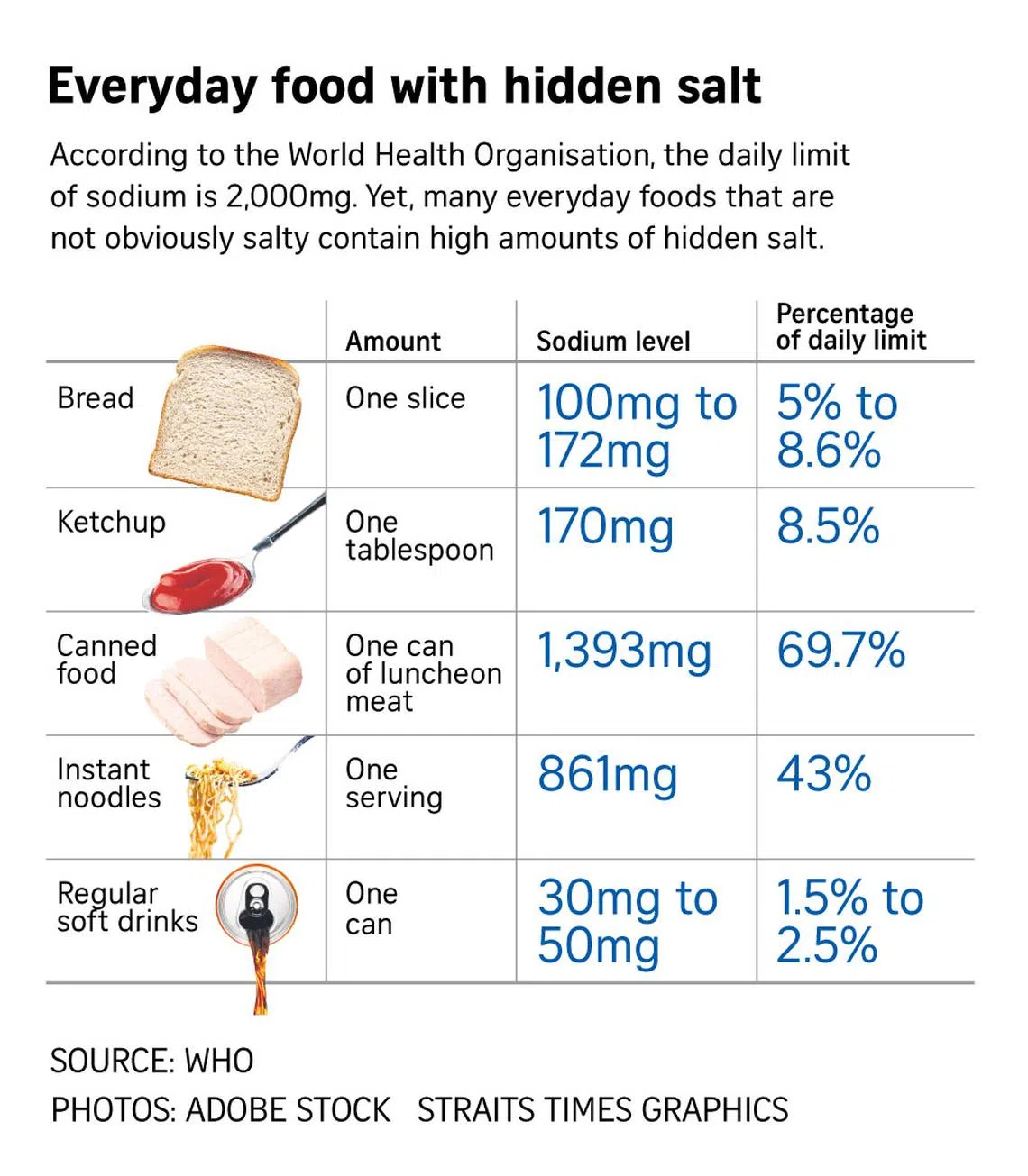 For example, a slice of bread contains 100mg to 172mg of sodium, making up between 5 per cent and 8.6 per cent of the daily limit recommended by the Health Promotion Board (HPB). A serving of instant noodles has 861mg of sodium.