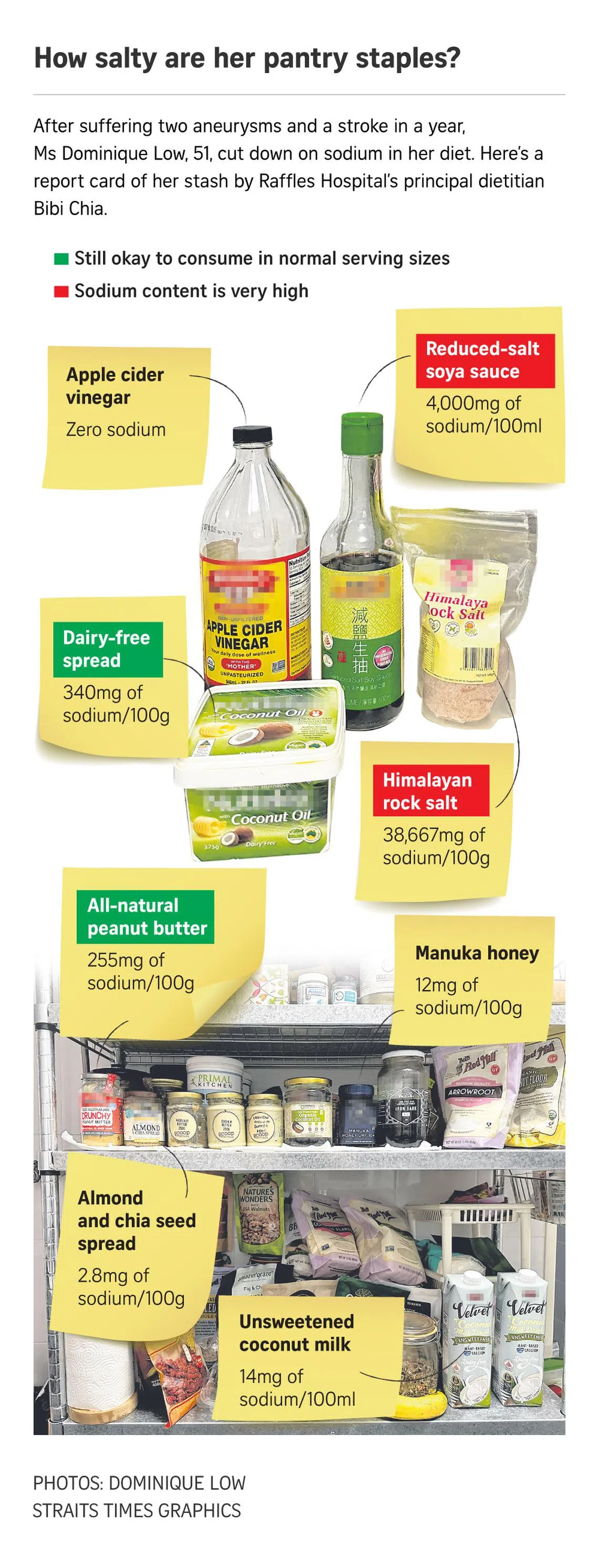 However, a peek in her pantry with the help of Raffles Hospital principal dietitian Bibi Chia showed that the sodium content of some of the choices Ms Low made were not as healthy as she thought they were.