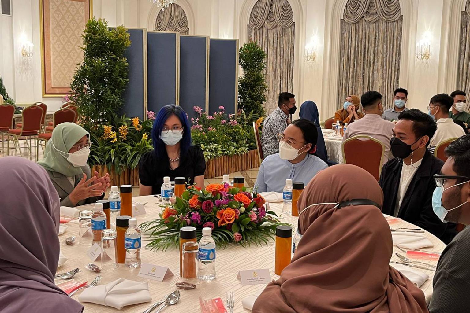 President Halimah Yacob (left) waiting to break fast with Malay/Muslim student leaders from Singapore’s 12 institutes of higher learning.