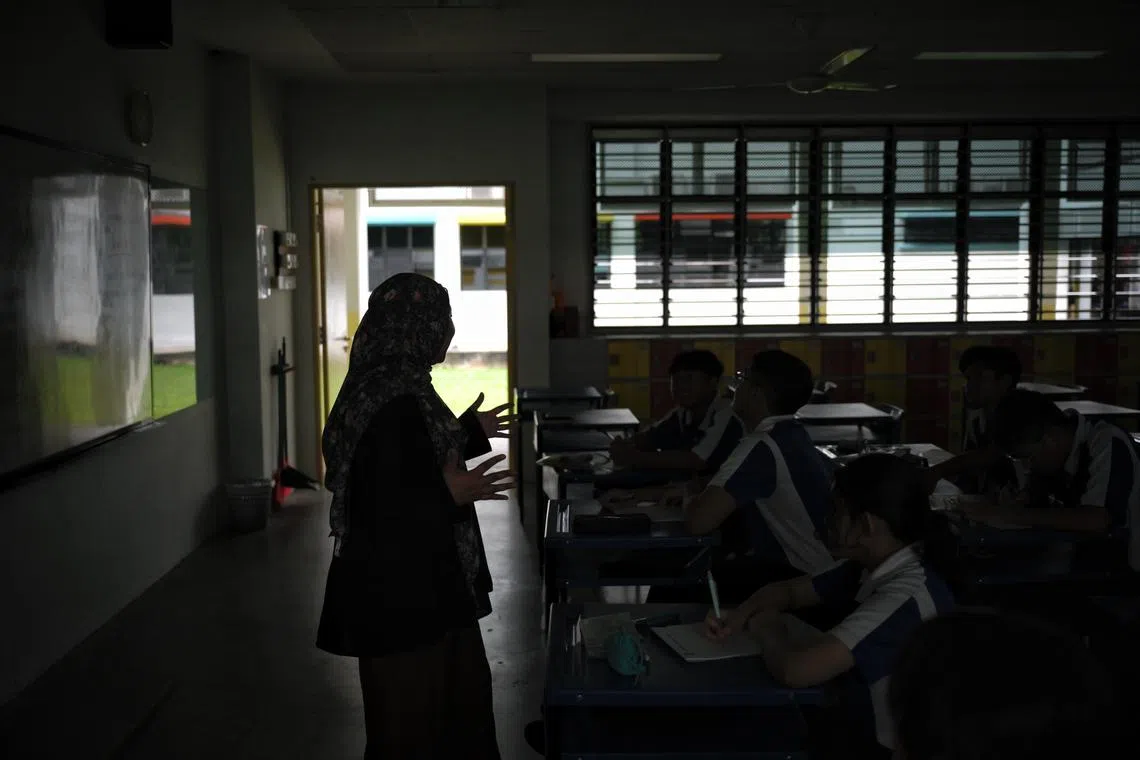 A Jurong West Secondary School teacher conducting a class during the power supply disruption exercise on Total Defence Day.