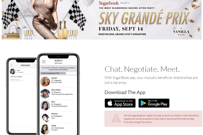 It was reported by The Straits Times and evening daily Lianhe Wanbao on Thursday that Sugarbook is one of the co-sponsors of the Sky Grande Prix, a party that will be held at a bar in the Grand Hyatt Singapore hotel from Sept 12 to 16.