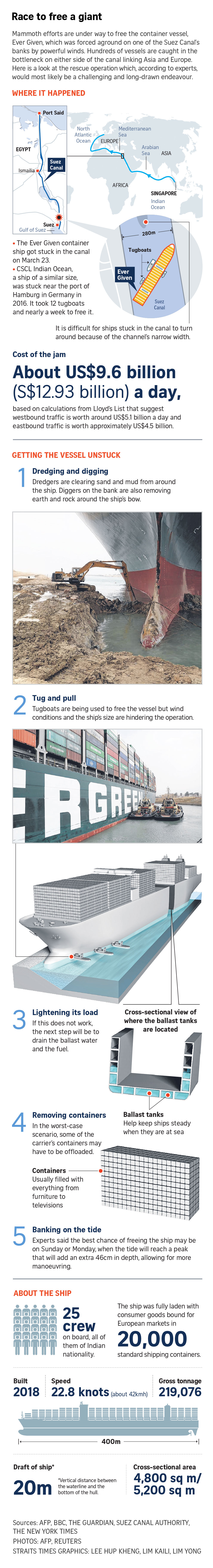 Tugs and diggers have so far failed to dislodge the 400m-long, 224,000-tonne Ever Given after it ran aground on Tuesday. The ship had lost the ability to steer amid high winds and a dust storm, said the Suez Canal Authority, and the effort to reopen the canal could take several days.
