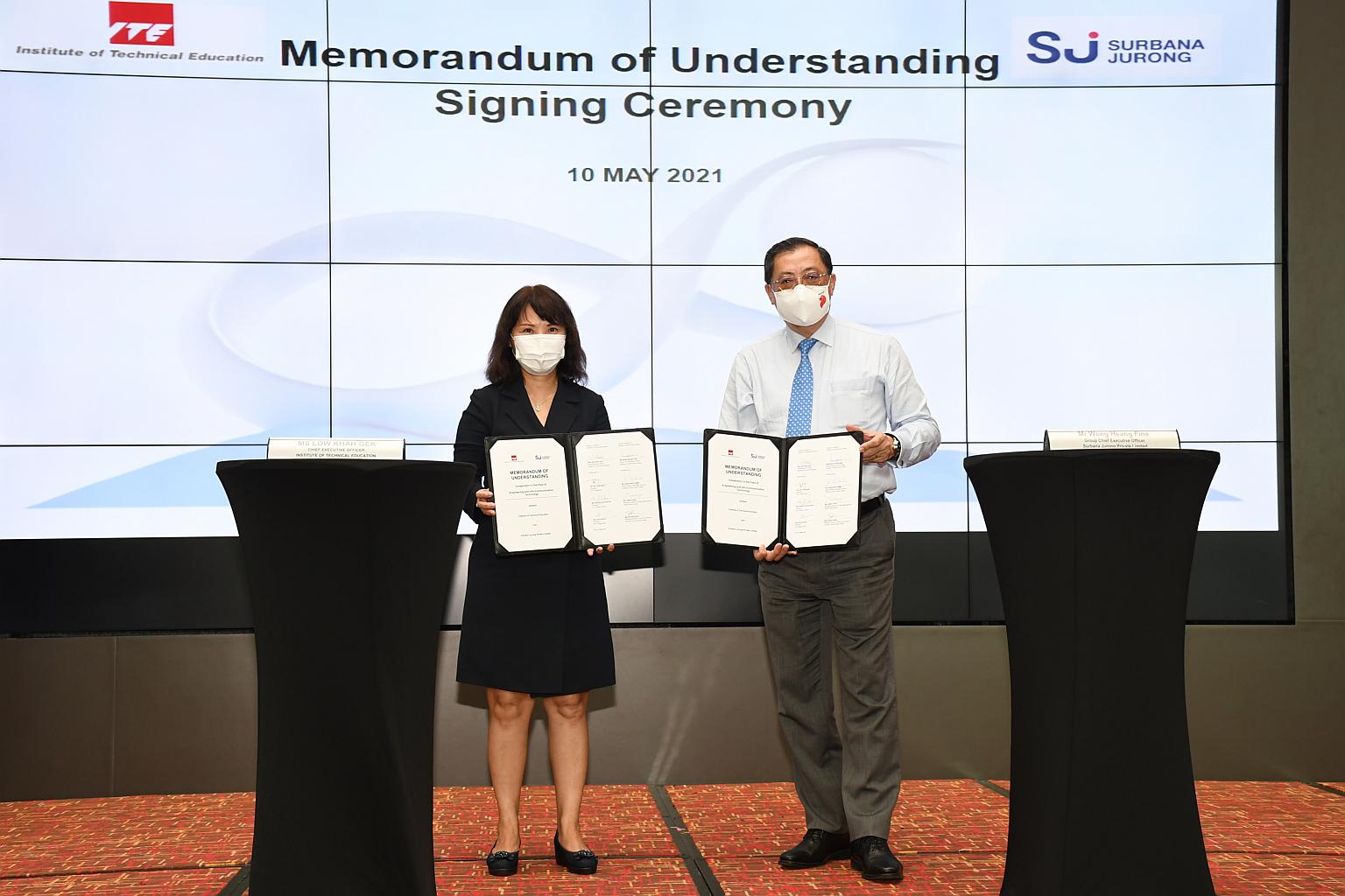 Institute of Technical Education CEO Low Khah Gek (left) and Surbana Jurong group CEO Wong Heang Fine at a signing ceremony on May 10, 2021.