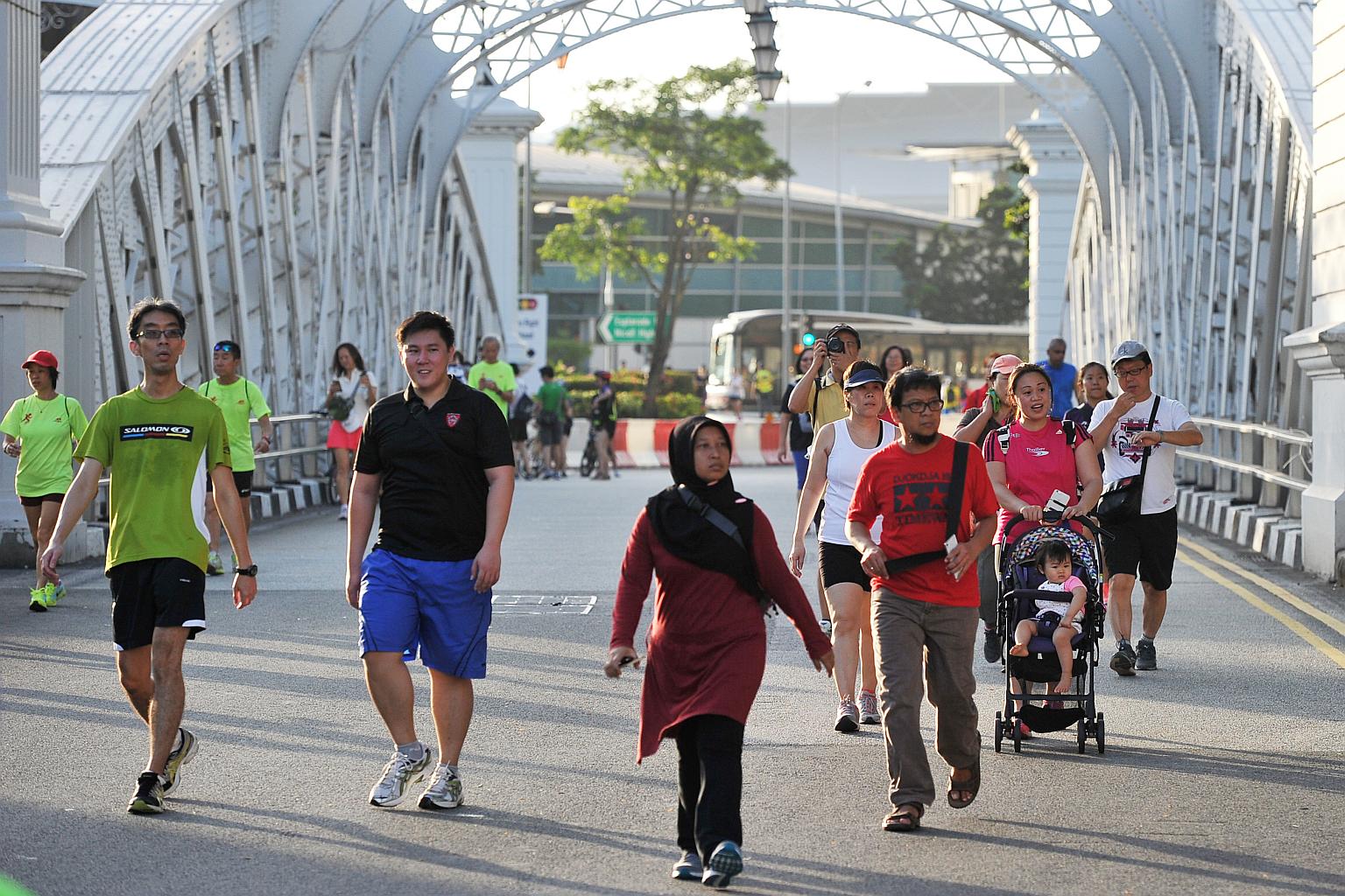 Families and joggers walking down the streets of the Civic District and Central Business District at the first Car-Free Sunday SG event on Feb 28, 2016.