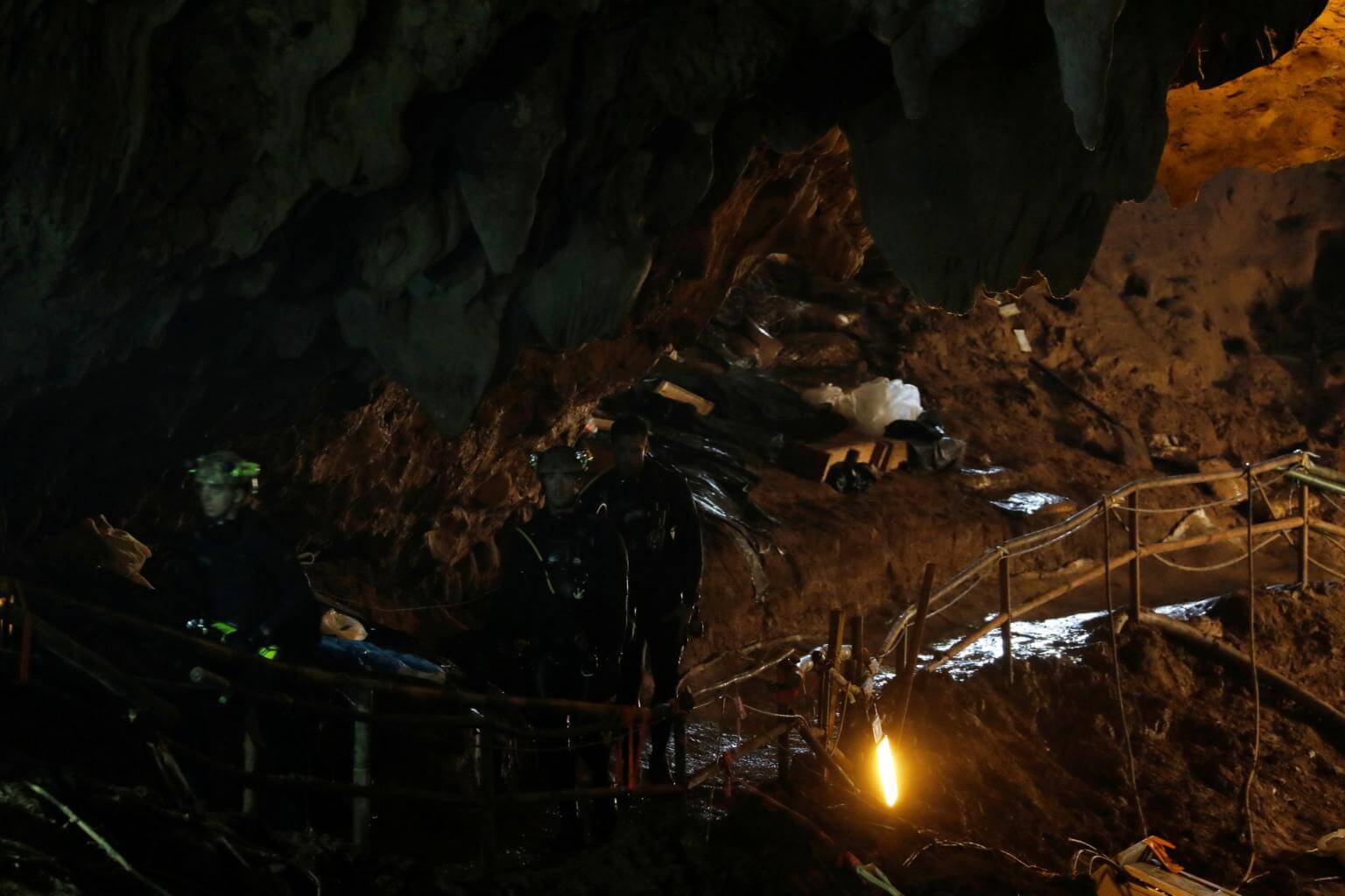 Divers walk inside Tham Luang cave complex, where 12 schoolboys and their soccer coach are trapped inside a flooded cave, on July 7, 2018.