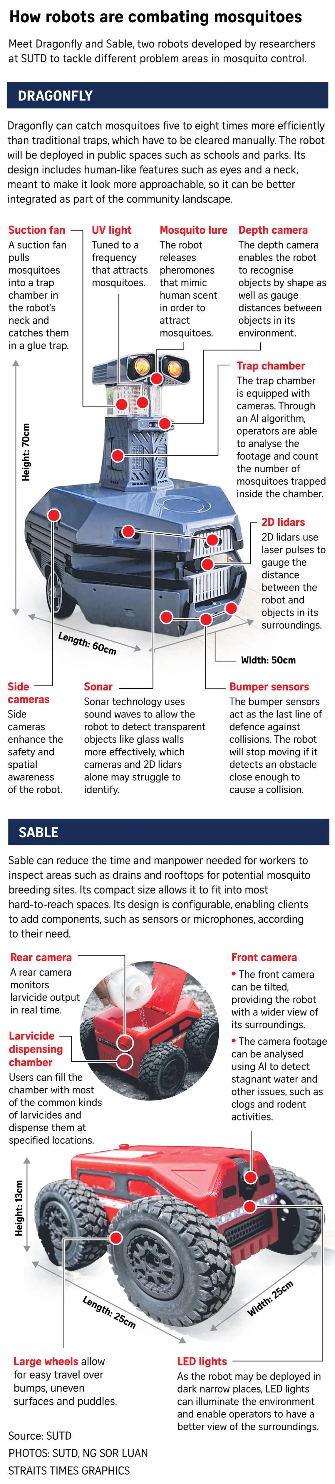 The SUTD-developed robot, named Sable, can inspect hard-to-reach areas and dispense larvicide to help combat mosquito breeding.