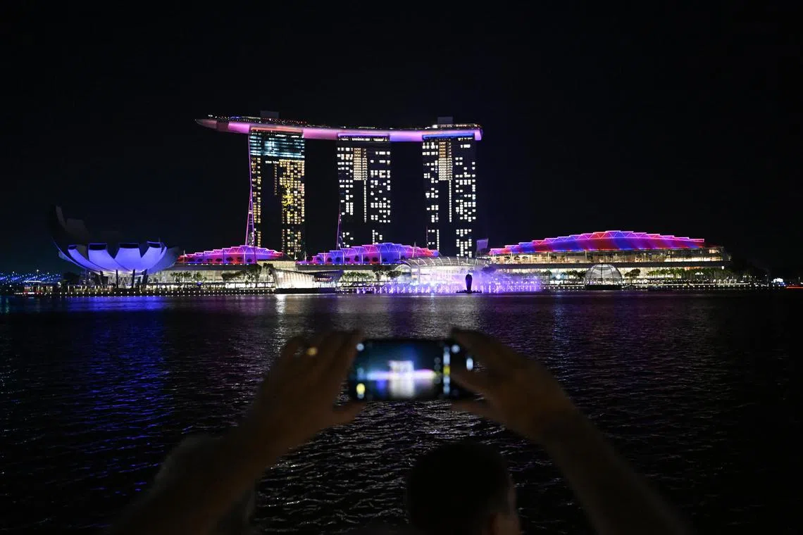 Marina Bay Sands’ facade lit up in Taylor Swift’s Eras Tour concert colours on Feb 28.