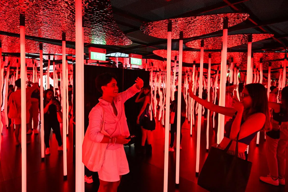 Visitors at the installation with mirrors and red light tubes from Swift’s Red era at Marina Bay Sands.