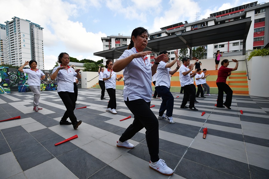 Members of a Taiji interest group holding a demonstration at the rooftop of Teck Ghee Community Club during its official opening on Jan 13. The upgraded community club now has facilities such as the Wellness Centre, meant as a space for elderly residents to mingle with their neighbours and engage in activities to keep their minds and bodies active. PHOTOS: ST FILE