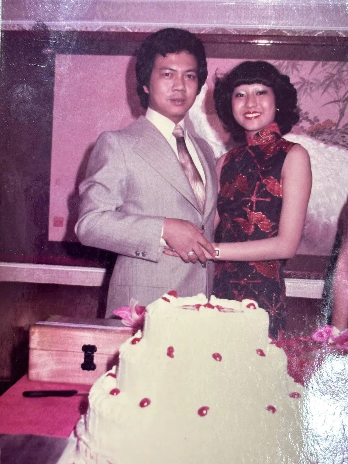 Mr Hsu Hu-chin’s father and mother pose in front of what looks like a wedding cake.