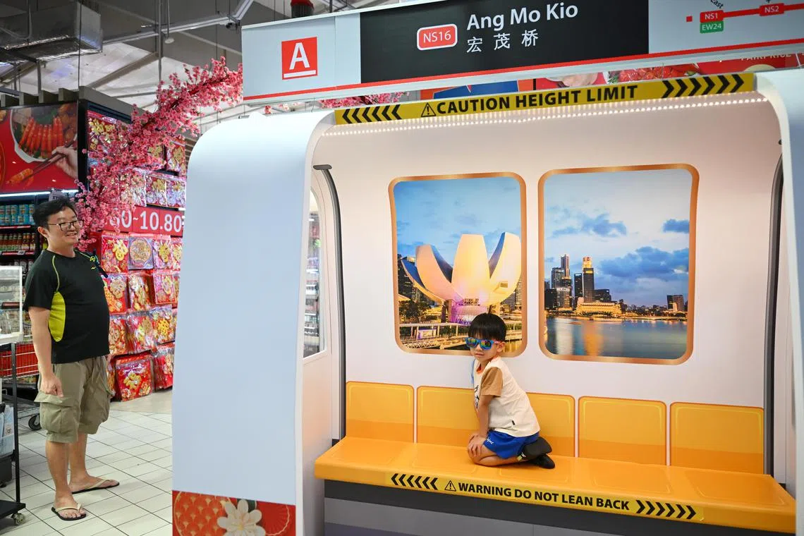 SINGAPORE – Did you spot a “train” or an “ERP gantry” while walking the aisles at AMK Hub’s FairPrice Xtra? These are part of the Chinese New Year decorations to make shopping fun.