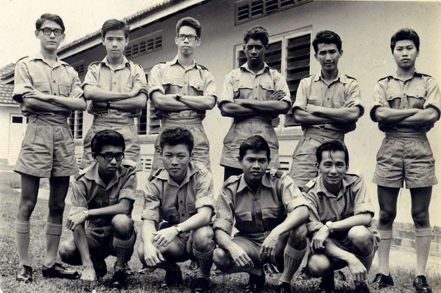 Mr Mohamed Haniffa (standing, fourth from the left) and Mr Derek Yeo (standing, second from the left) at RAF Training Centre in RAF Seletar, with their Aero Engine course mates. This photo was taken in August 1965.