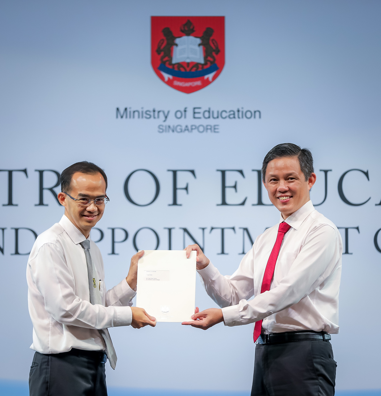St. Andrew’s Junior College principal Tham Kine Thong (left) receiving his appointment letter from minister Chan Chun Sing.