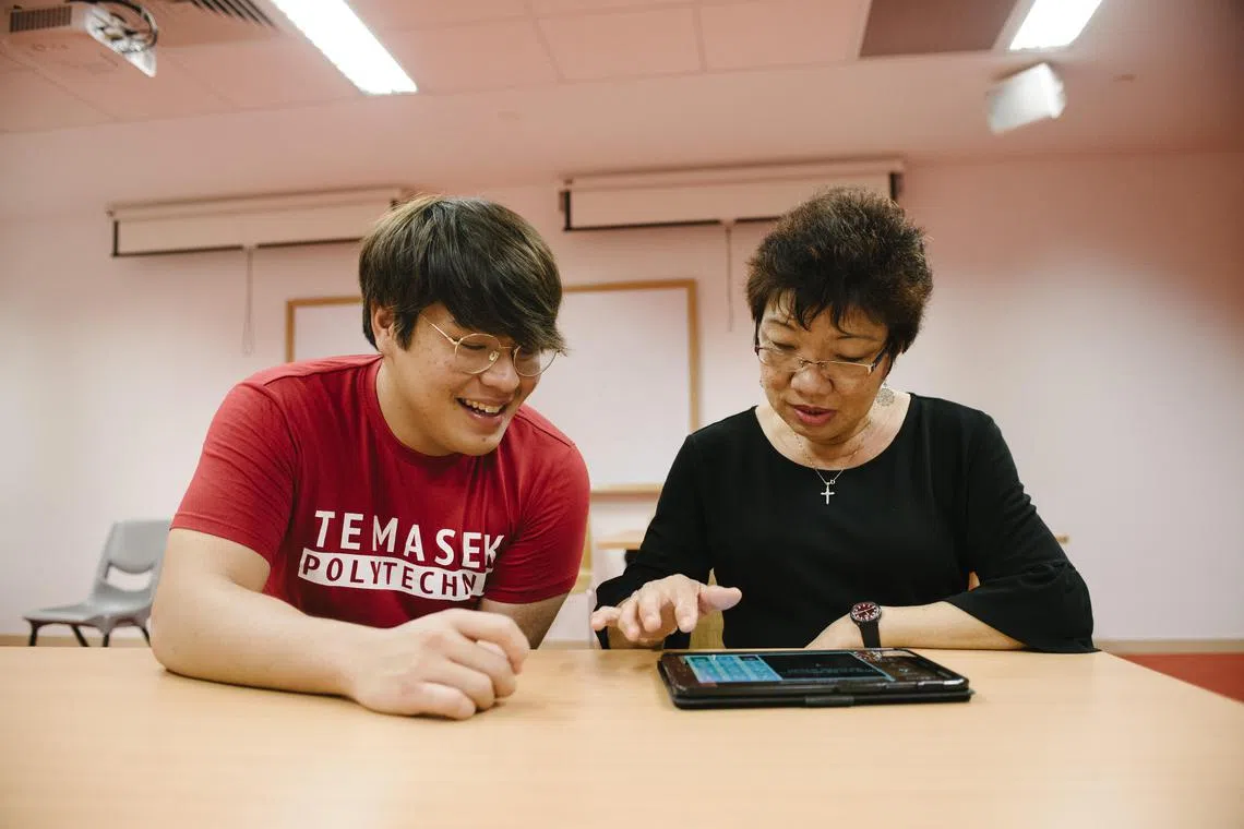 Temasek Polytechnic student Keith Zheng teaches retiree Katherine Chua how to use Mindworks, a brain-training mobile app.